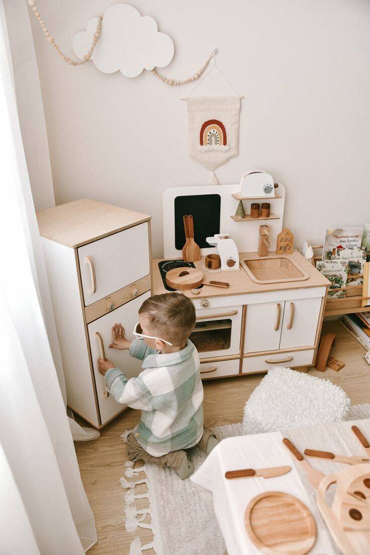 On the photo: Montessori nature toys | Kitchen | Round rug | Storage cabin