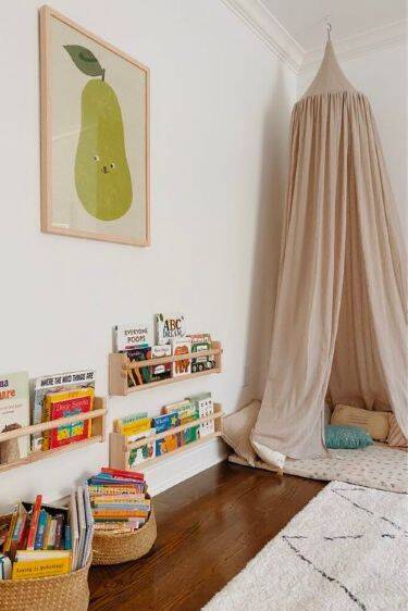 Reading is an essential part of Montessori education, so make sure there’s a cozy, inviting reading area in the room. Place a small bookshelf within reach and offer a rotating selection of books on a low shelf. Add a soft rug, pillows, or a child-sized chair where your child can curl up comfortably.