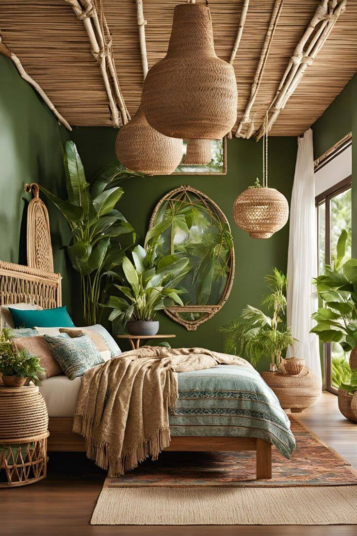 On the photo or in the same style: Tropical wallpaper | Rotan bedside table | Rotan mirror | Rotan lamp